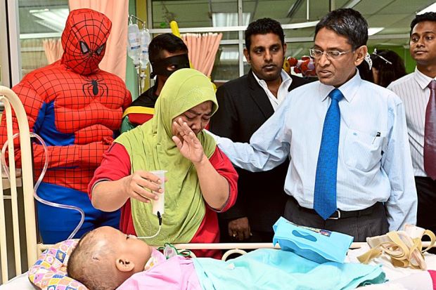 A group of costumed superheroes such as Spider-Man, Batman and other characters, together with Subramaniam, visited the children to spread Hari Raya cheer.