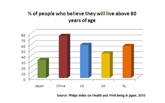 The recently published Philips Index for Health and Well-being in Japan provides some interesting insights into aging and healthcare in Japan. A majority of Japanese (63.8%) expect to live to be over 70 years old, though only 2.9% expect to live to be over 90 years of age. Also, when asked if they expected to live longer than their parents, only 16.3% answered in the affirmative. This suggests that despite the fact that Japan boasts the longest life expectancy in the world (79 for men, 86 for women)**, Japanese people are losing hope about their expectations of a long lifespan.