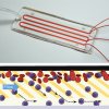 The device consists of a serpentile channel with two inlet and outlet ports. The cell mixture is injected parallel to a buffer stream into the device and a pure stream of target cells is retrieved from the outlet port. The straight segments of the microfluidic separation channel are patterned with parallel gold stripes grafted with P-selectin, which allows the target cells to interact with the patterns and roll on them. The asymmetry of the patterns with respect to the flow alters the trajectories of the target cells such that they roll along the edge of the pattern (shown with dotted line) and get displaced into the buffer stream.