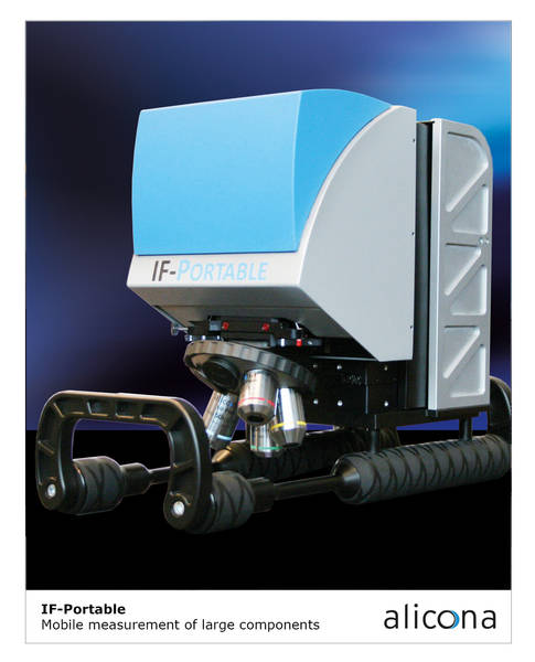 IF-Portable, the advanced optical 3D micro coordinate measurement device from Alicona is designed for measuring roughness and form on large components with plane and curved geometries. Even under production conditions, this mobile form and roughness measurement device provides traceable, repeatable and stable results. The IF-Portable covers measurement areas with up to 50x50x19 mm dimension and is based on Focus-Variation technology.