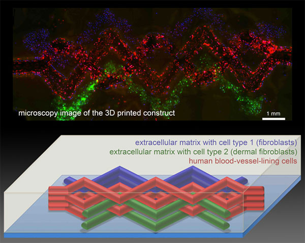 Artificially printed tissue may one day revolutionize how diseased organs are treated, fractured bones are fixed, and drugs are tested without human subjects. A great deal of progress has already been made toward this goal, but a major hurdle, that of integrating vasculature and bringing together different cell types into a functional whole, has significantly limited that progress. Now researchers at Harvard University report in journal Advanced Materials on a new method of 3D printing constructs made of three different cell types, including ones that line blood vessel walls.