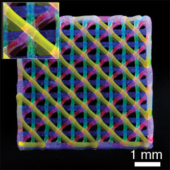 To print 3D tissue constructs with a predefined pattern, the researchers needed functional inks with useful biological properties, so they developed several “bio-inks”—tissue-friendly inks containing key ingredients of living tissues. One ink contained extracellular matrix, the biological material that knits cells into tissues. A second ink contained both extracellular matrix and living cells.