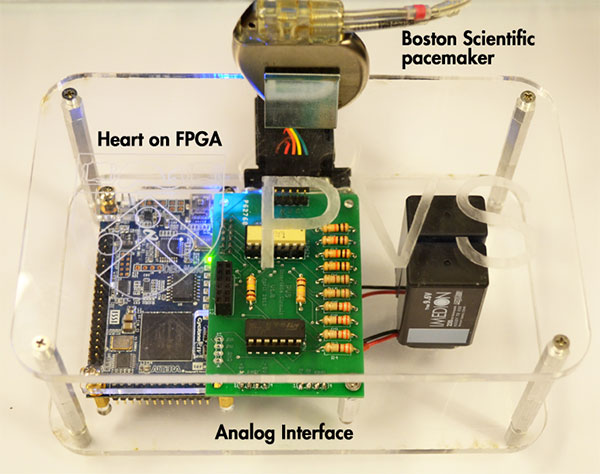 Implantable electrocardiac devices, being in charge of keeping people alive, necessarily require a lot of testing to avoid deadly malfunctions. Yet, while testing the computer code inside a pacemaker using traditional means can find a lot of bugs, having a simulated heart which can go quickly through thousands of combinations of states a heart can be in, can help find a lot more nuanced ones.