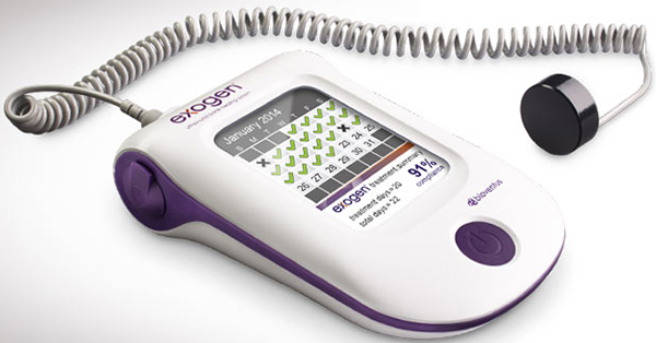 The latest version of the device includes a treatment calendar, as well as a history of when therapy was applied. This allows docs to keep an eye on patients’ compliance with therapy and to know whether it is not helping or the patient simply forgets to use it. To further help patients to keep up with the treatment schedule, the EXOGEN device has a matching iOS/Android app that can issue reminders and also includes videos on how to use the system. Comparing the EXOGEN to the previous version of the product, it is now splash-proof and has a color LCD screen.