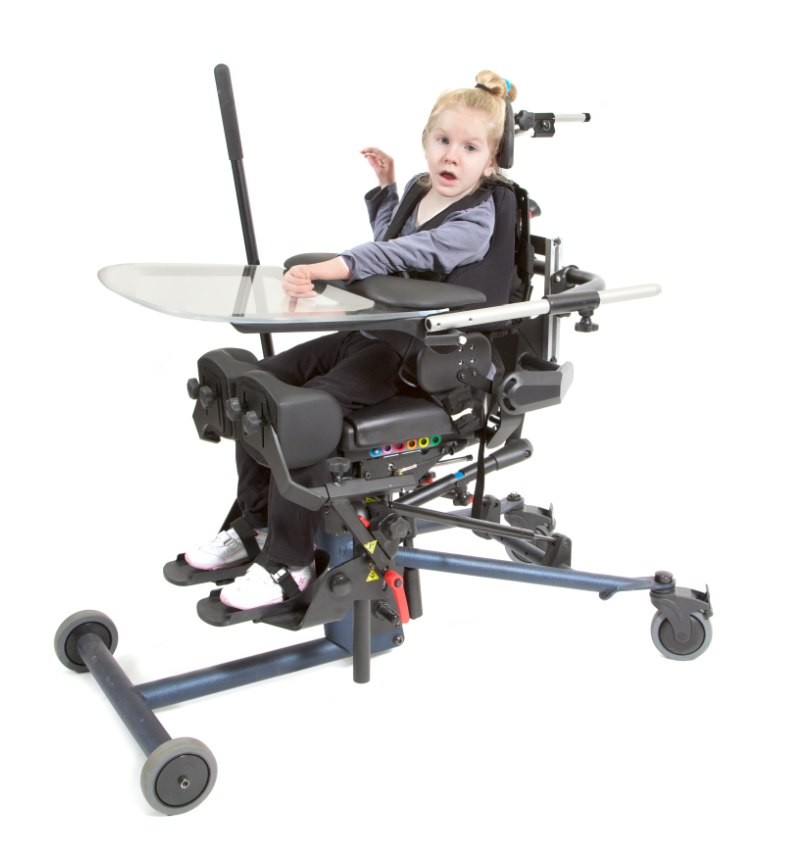 EasyStand bantam sit-to-stand stander, medium combines features from both the Bantam and Evolv series to accommodate the larger, involved child. Transfers become more difficult with the growth of the child, and as a result, compliance with a standing program often suffers. EasyStand bantam medium allows transfers to a seated or supine position, or any position in between. Bantam stander's central positioning controller shifts between sit to stand and supine modes. The “Neutral” setting allows infinite positioning between seated and supine while a manual hydraulic actuator lifts the child to a standing position.