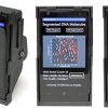 Designed at UCLA’s California NanoSystems Institute, the device accepts disposable chips within which the DNA is tagged and stretched out. The actual microscope is attached to a Windows smartphone and basically includes a dark room, lens, laser, thin-film interference filters, and a mechanical adjuster that adjusts focus by moving the sample in front of the lens. Special software was developed that captures the images and sends them to a server for final processing. Results come back and are displayed on the smartphone app, allowing the technology to be used anywhere with a cellular signal, even though the heavy computational processing is taken care of far away.