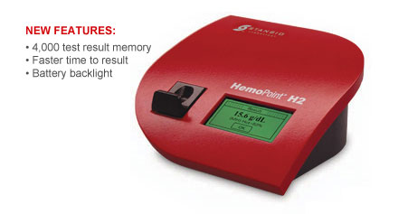 Using a single drop of blood, Stanbio HemoPoint?H2 offers accurate results for both hemoglobin and hematocrit (calculated) tests in as little as ten seconds! The touch screen displays the current time, battery status and has a new battery backlight feature improving readability throughout the self prompting test procedure.