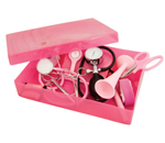 Our Pink Nurses Set includes: Stethoscope, Sphygmo, Tourniquet, Face Shield, Dressing Scissors, Artery Forceps, Fob Watch, Utility Scissors, Hand Sanitiser & Pen Light.