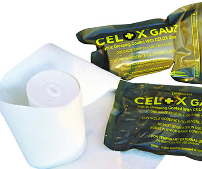 The power of Celox™ is available on a Gauze. Celox™ Gauze is an instinctive way of using Celox™ to stop even severe bleeding or hemorrhage. Just pack the wound and apply pressure – its safe, easy and very effective.