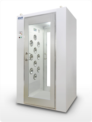 Air Showers are self contained chambers installed at entrances to cleanrooms and other controlled environments. They minimize particulate matter entering or exiting the clean space. Personnel and materials entering or exiting the controlled environment are "scrubbed" by high velocity ULPA-filtered air jets with velocities of 24-26 m/s (4724-5118 fpm). Contaminated air is then drawn through the base within the unit, filtered and recirculated.